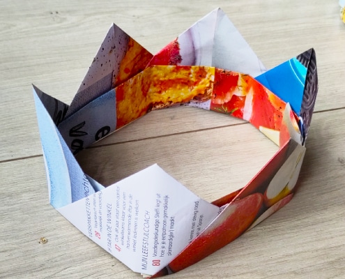 Wil je er de hele dag bijlopen als een echt koning of koningin op Koningsdag dan kan een kroon niet ontbreken. Met 5 of 6 tijdschrift bladzijden maak je al een prachtige kroon. Knip de bladzijden in vierkanten van 15 x 15cm en vouw ze volgens de instructie. Als je het leuk vind, kun je de kroon ook beschilderen met rood, wit, blauw en oranje.