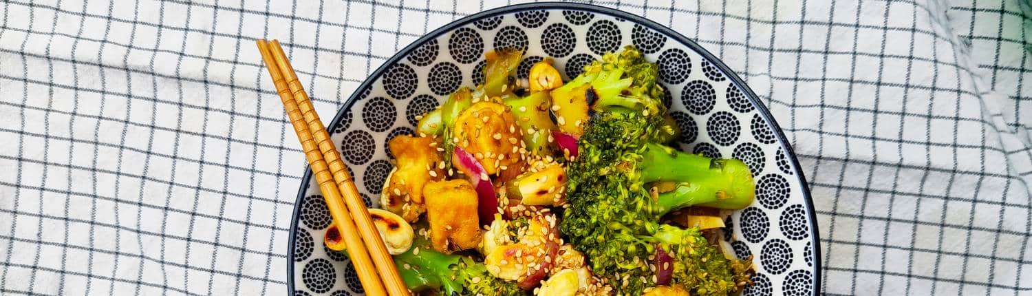 Deze roerbak met tofu, broccoli en cashewnoten is: