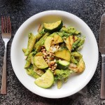 Serveer de pasta pesto met de gegrilde courgettes en geroosterde pijnboompitten