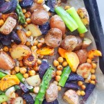 Leg de aardappelen, wortelen, kikkererwten, hele tenen knoflook en uienringen op een bakplaat